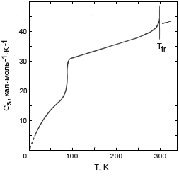 Теплота плавления III хорошо воспроизводилась. Единственная обнаруженная на кривой СsТ III аномалия типа G, не сопровождающаяся скрытой теплотой перехода, вероятно, связана с «замораживанием» фазы, стабильной ниже Тm. Величина наблюдаемого скачка теплоемкости (~8 кал·моль-1·град-1) позволяет предположить, что выше этого перехода имеет место заторможенное внутреннее вращение, а также заторможенное вращение молекул в целом.