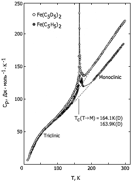 На кривых температурной зависимости теплоемкости (рис. 1) виден верхний переход при 242К у ферроцена и 251К у дейтероферроцена. Это равновесный фазовый переход I рода из стабильной низкотемпературной орторомбической фазы в стабильную высокотемпературную моноклинную фазу. Энтальпия этого перехода 4,145 кДж·моль-1, энтропия 17,13 Дж·моль-1К-1 (у обычного ферроцена). На рис. 2, также по теплоемкости, показан нижний переход λ-типа. Это переход образующейся при охлаждении быстрее чем 1K в минуту метастабильной низкотемпературной триклинной фазы в метастабильную же переохлажденную высокотемпературную моноклинную фазу. Температура его 163,9К у Н- и 164,1К у D-ферроцена; энтальпия его 0,90 кДж·моль-1, энтропия 5,5 Дж·моль-1К-1 (у Fe(C5H5)2). Ниже λ-перехода можно метастабильную низкотемпературную фазу перевести в стабильную низкотемпературную фазу (термообработка при 190К), причем при 156К выделяется 3,3 кДж·моль-1 энергии.