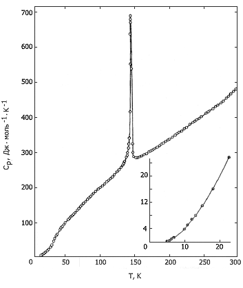 По площадям, заключенным между кривыми Ср = f(T) и Ср =f(lnT) с λ-переходом и соответствующими интерполяционными кривыми, рассчитаны энтальпия и энтропия этого перехода, равные 1640 ± 17 Дж·моль-1 и 11,5 ± 0,1 Дж·моль-1К-1. Кроме того, энтальпия перехода определена методом непрерывного ввода энергии в калориметр с веществом в адиабатических условиях (этот метод обычно применяется при определении энтальпии плавления). Полученная величина ΔtrН в пределах 0,2% совпала с приведенным выше значением.