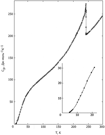 При быстром охлаждении I до 80К он стекловался, а в процессе нагрева, около 190К расстекловывался. Образующаяся при этом переохлажденная жидкость кристаллизовалась. Кристаллы I плавились при Тm = 275,5К; ΔmH = 1172 ± 21 Дж·моль-1. Теплоемкость II изучена только в жидком и стеклообразном состояниях. Температура стеклования его Tg = 185К. Закристаллизовать II в условиях калориметра не удалось.